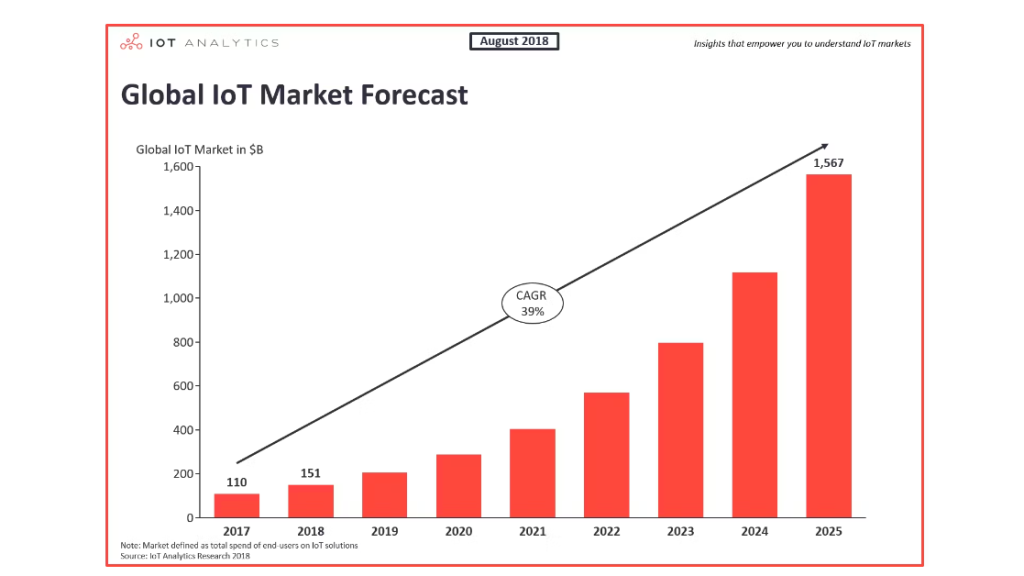 The future of IoT guarantees extra interconnected gadgets, from smart cities to industrial automation. From an analysis done by IOT ANALYTICS, the global market for the Internet of Things (end-user spending on IoT solutions) is expected to grow 37% from 2017 to $151B. It is predicted that the total market will reach $1,567B by 2025.